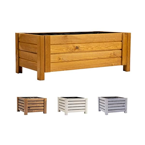 Sie haben die Wahl aus vier Farbvarianten. Mit einem Maß von 38cm x 38cm x 25cm oder 79cm x 39cm x 30cm (L x B x H ) trägt dieser Pflanztopf nicht allzu sehr auf und bietet dennoch genügend Platz für die gängigen Balkon- und Terrassengewächse. Zur Produktion wurde ausschließlich gut getrocknetes und gehobeltes Kiefernholz mit großen Querschnitten verwendet. Dies verleiht der Konstruktion eine enorme Steifigkeit und verhindert zudem eine frühzeitige Verwitterung. Zusätzlich ist die Blumenkiste mit Imprägniermittel im Tauchverfahren überzogen, sodass eine grundlegende Witterungsbeständigkeit gegeben ist. Bei Aufstellung im Freien, sollte jedoch regelmäßig ein Schutzanstrich erfolgen.