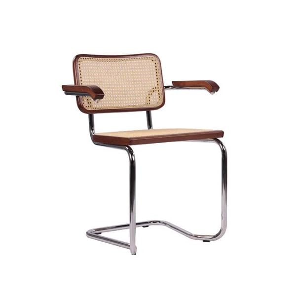 Den Freischwinger kann man platzsparend bis 4 Stück stapeln. Die Farbe des Holzrahmens ist nussbaum